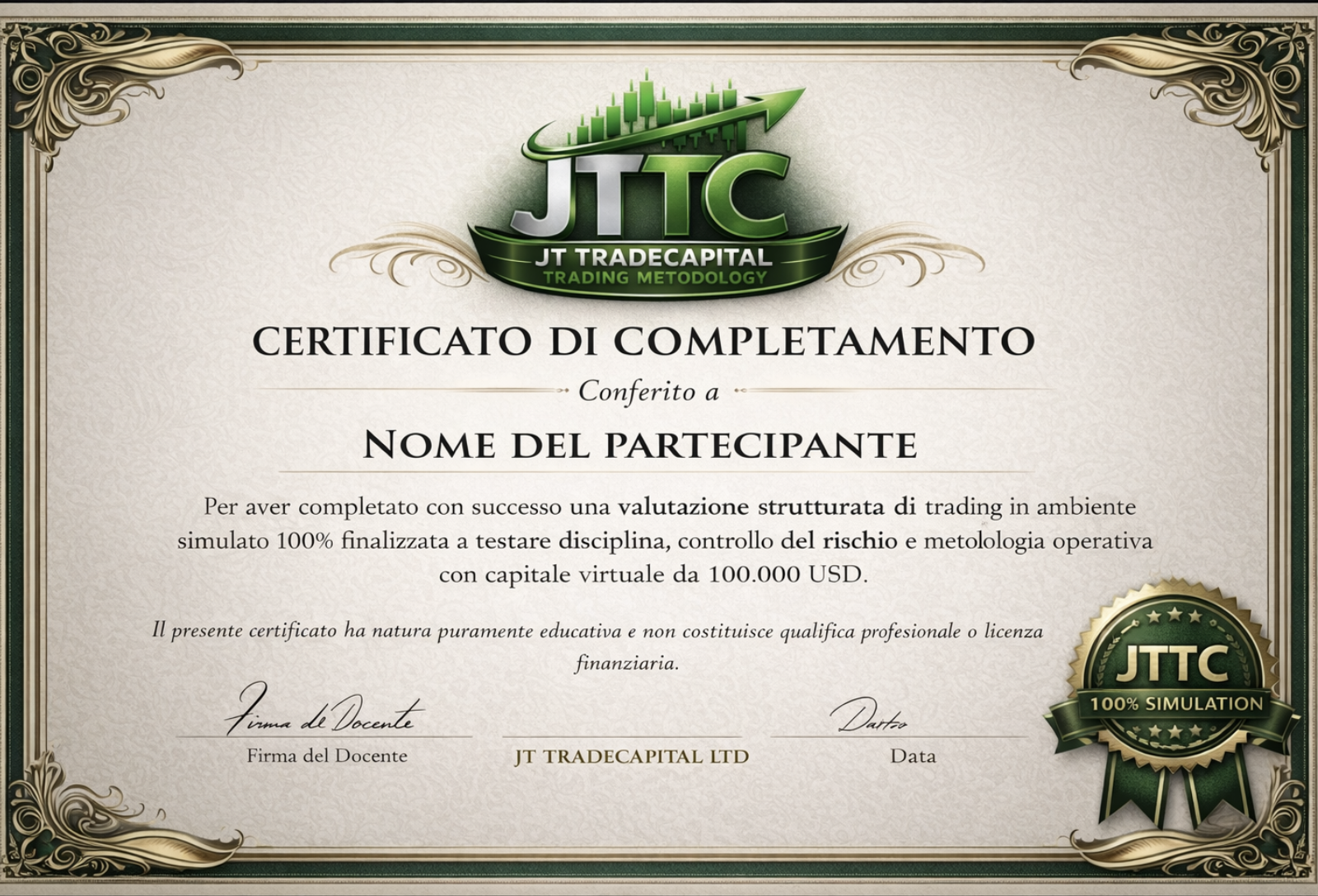 La certificazione rilasciata attesta il completamento con esito positivo di una valutazione strutturata di trading in ambiente simulato, svolta secondo i criteri metodologici previsti dal programma JTTC.